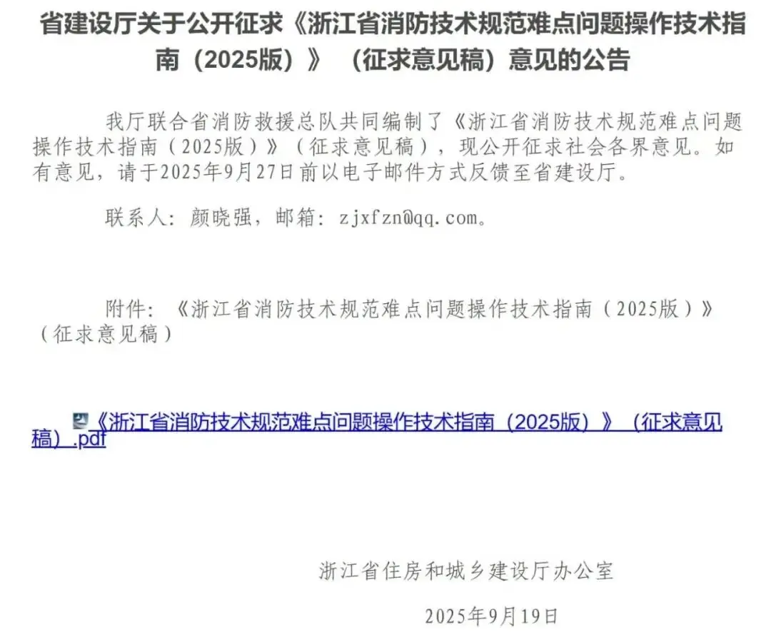 100yxg 《浙江省消防技术规范难点问题操作技术指南》自2014年首版发布以来,基本上每两三年更新一次。浙江指南理念先进,技术前沿,内容翔实,广受业界好评。很多条款常被其他各地消防技术标准借鉴参考。为设计、施工及消防审验提供了精准可靠的技术依据与解决方案,对提升全省火灾防控能力、保障人民生命财产安全具有重大实践价值,堪称地方标准的标杆之作。此次公开发布征求意见稿,征求业界同行的宝贵意见。 备注:征集已结束!<点击了解详情>