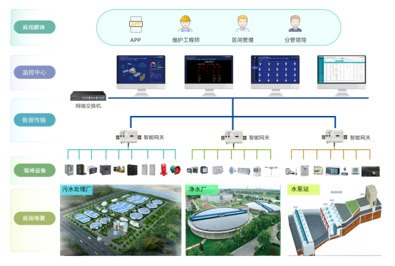 通过云计算、大数据和人工智能等新一代的互联网技术,加上水务集团多年积累的行业知识和工艺技术,结合智慧化的运营管理理念,推出面向水务行业的智慧水务运营管理平台,面向地区水务集团下属的水处理设施,建立“数字化”应用和标准化运营体系,实现运营管理能力的深度提升。基于信息流的集成,构建具有"设备互联、数字集成、智能预测"等特征的智能云平台的运行体系。